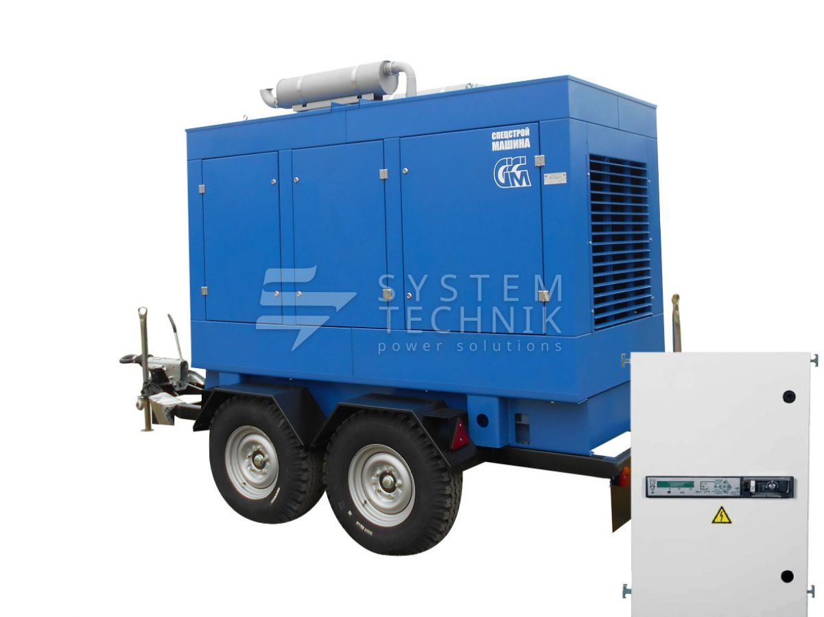 - ССМ ЭД-100-Т400-2РПМ2 в погодозащитном кожухе на шасси с АВР на прицепе